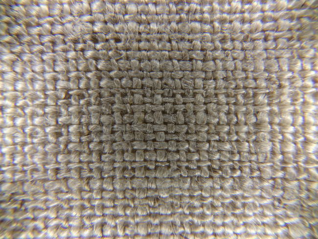 The Belgian portrait-grade linen (shown here under a microscope) costs about $30 per yard for a 54" wide piece. This is Dick Blick portrait medium (8.85oz). You can see that it has a tight weave and there are no large holes visible between the threads. There's some random variation in the texture which is part of the attraction of using this as a painting surface.