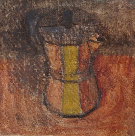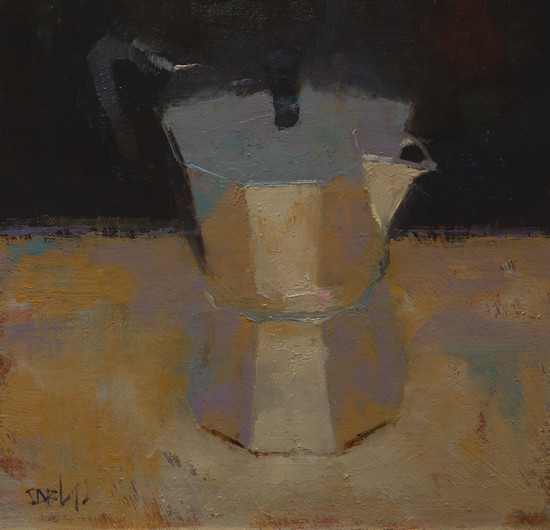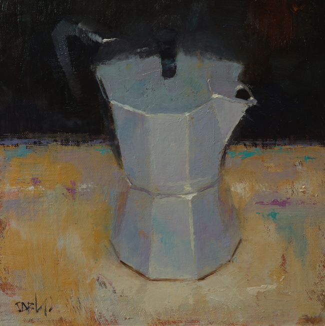 The coffee pot is set on my pochade box next to my easel and is illuminated by the overhead studio light.